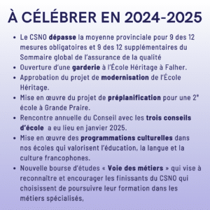 Le Conseil scolaire remercie chaleureusement le personnel, les communautés scolaires et les partenaires, grâce à qui le CSNO a pu maintenir des milieux d’apprentissage de qualité, sécuritaires et inclusifs, favorisant le sentiment d’appartenance et le développement identitaire des élèves.