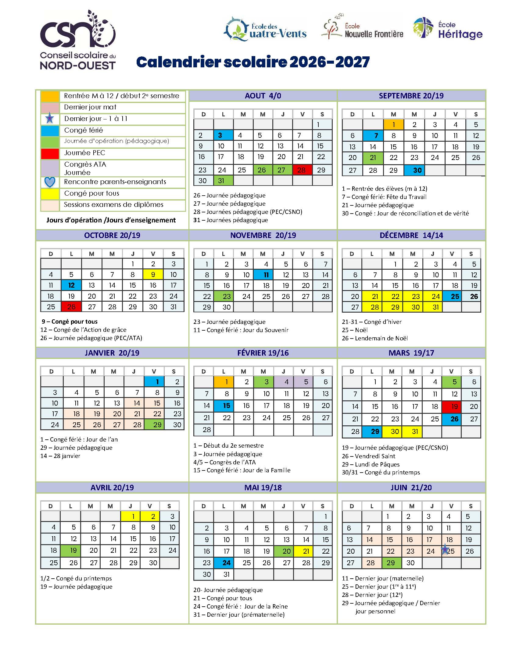 Calendrier 2026-2027 – ÉNF – ÉQV – ÉHÉ