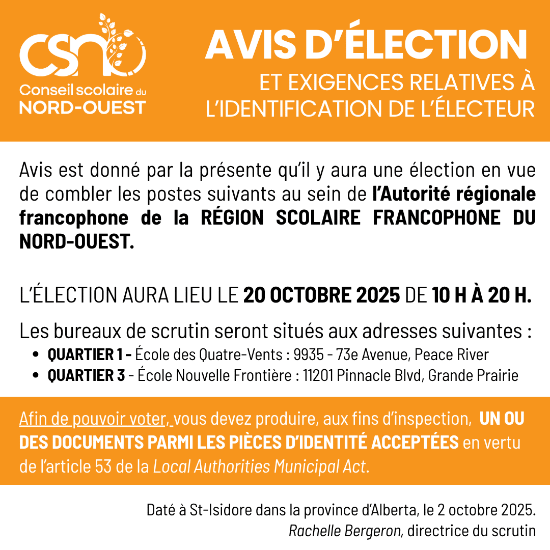 Voir l’information pour les électeurs : https://csno.ab.ca/le-conseil/elections-scolaires/