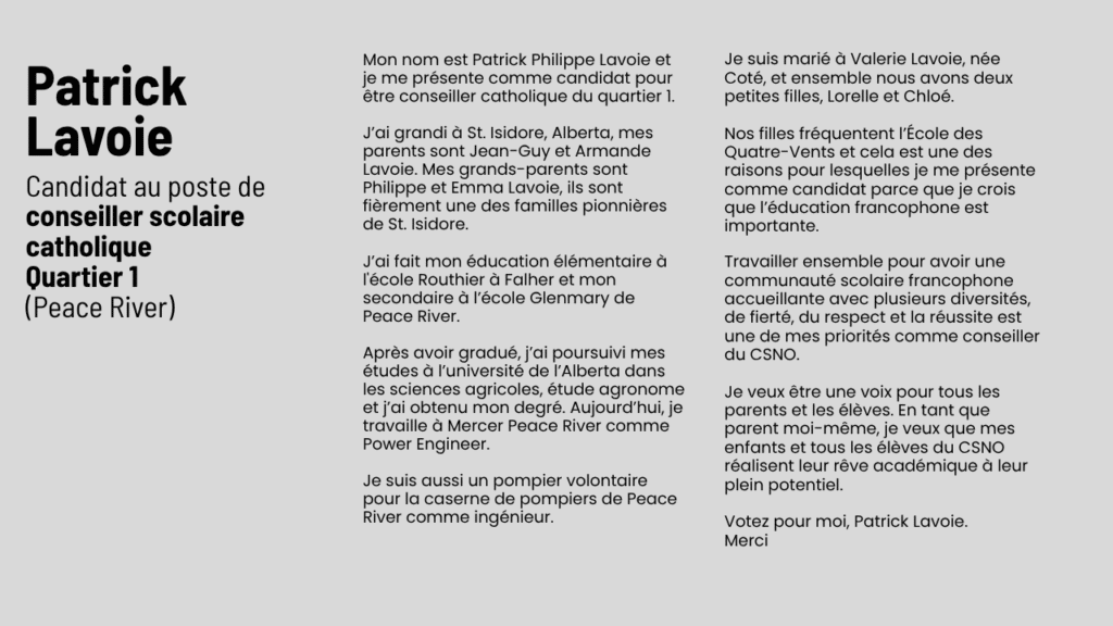 Patrick Lavoie | 16 septembre 2025 | Quartier 1 CATHOLIQUE (région Peace River) |