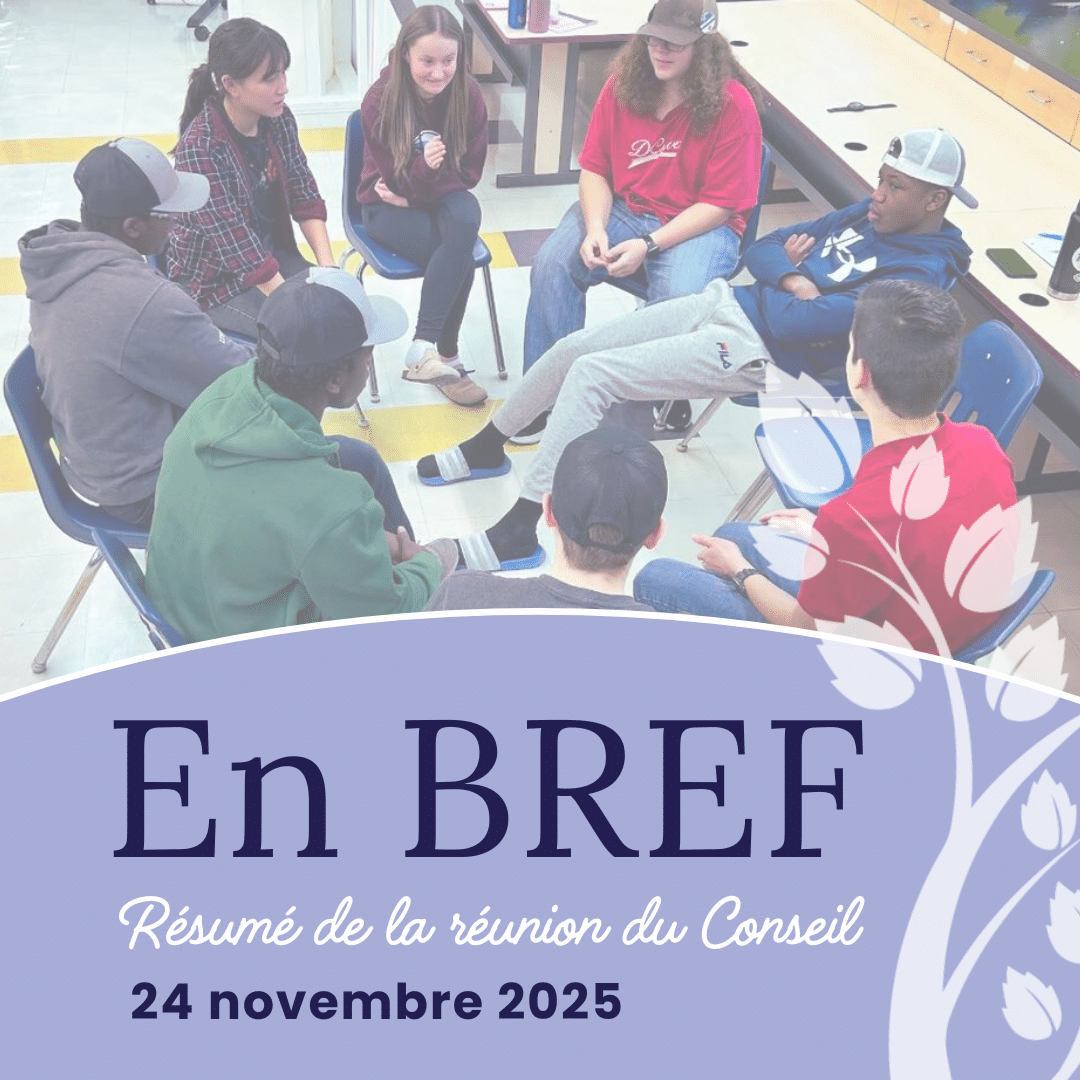 En BREF (ENGLISH) RÉUNION ORDINAIRE RRAÉ 2023-2024 Le 29 novembre dernier, le Rapport des résultats annuels en éducation (RRAÉ) du CSNO a été approuvé. Pour en savoir plus sur le RRAÉ, cliquez ICI. Mise à jour budget 2024-2025 Le conseil a […]