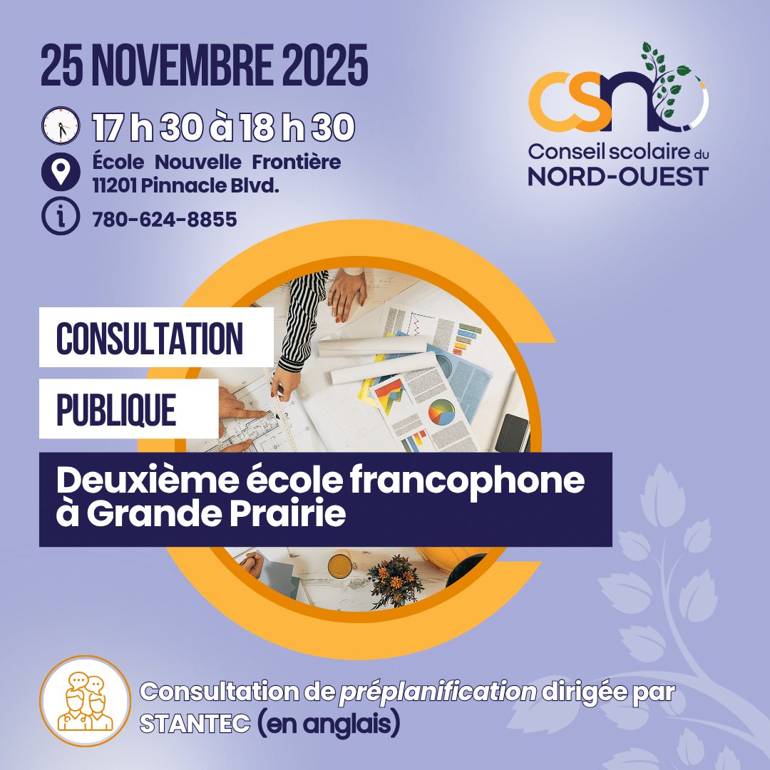 Chers parents et membres de la communauté, Nous vous invitons à participer à une consultation importante pour l’avenir de l’éducation francophone à Grande Prairie. Une consultation de préplanification pour évaluer le projet d’une école (M à 6) francophone pour le […]